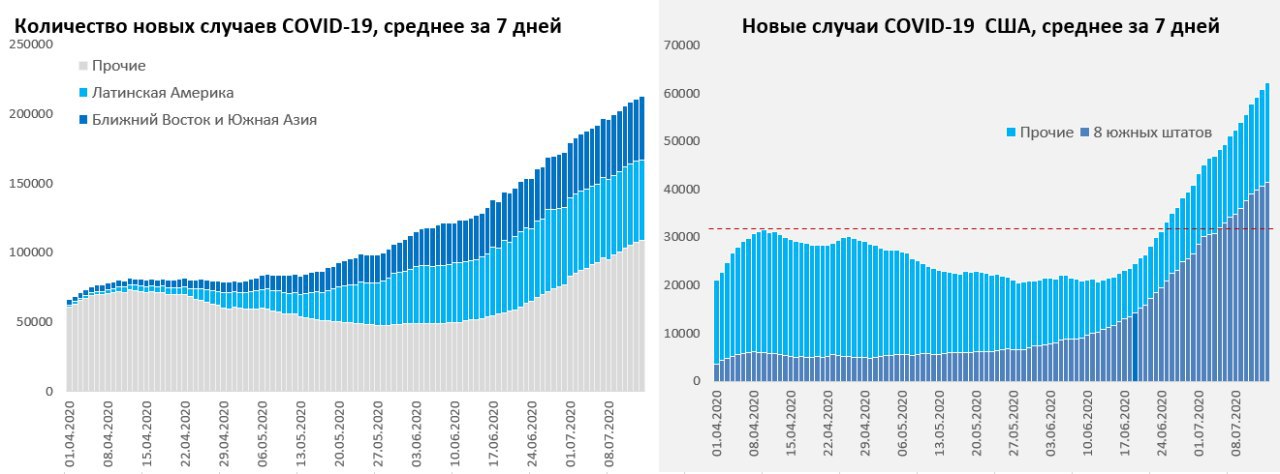 В мире процесс развивается в негативном направлении, среднее за 7 дней количество новых случаев превысило около 197 тыс. в день. Америка продолжает набирать обороты, впервые за все время прирост новых случаев за день в США оказался выше 60 тыс., в среднем за 7 дней ежедневно выявлялось 52 тыс. новых случаев в день. Ускоряется рост количества госпитализированных в США, их уже 43 тыс. (на минимумах было 28 тыс.), хотя до пиковой нагрузки все еще далеко (на максимумах было 60 тыс.). Южные штаты США сохраняют темп и генерируют уже 35 тыс. новых случаев в день.