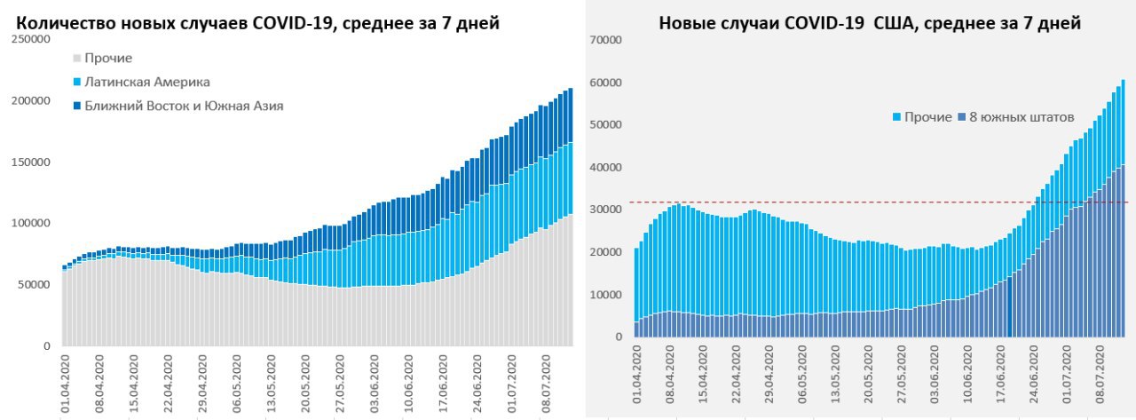 В мире продолжает расти количество новых случаев, среднее за 7 дней приблизилось к 213 тыс. в день и рост продолжается. Америка ежедневно прибавляет, в среднем за 7 дней ежедневно выявляется более 60 тыс. новых случаев, именно США генерирует сейчас основной прирост. Количество госпитализированных в США продолжает расти и превысило 55 тыс. человек. Южные штаты США генерируют более 40 тыс. новых случаев в день в среднем за неделю.