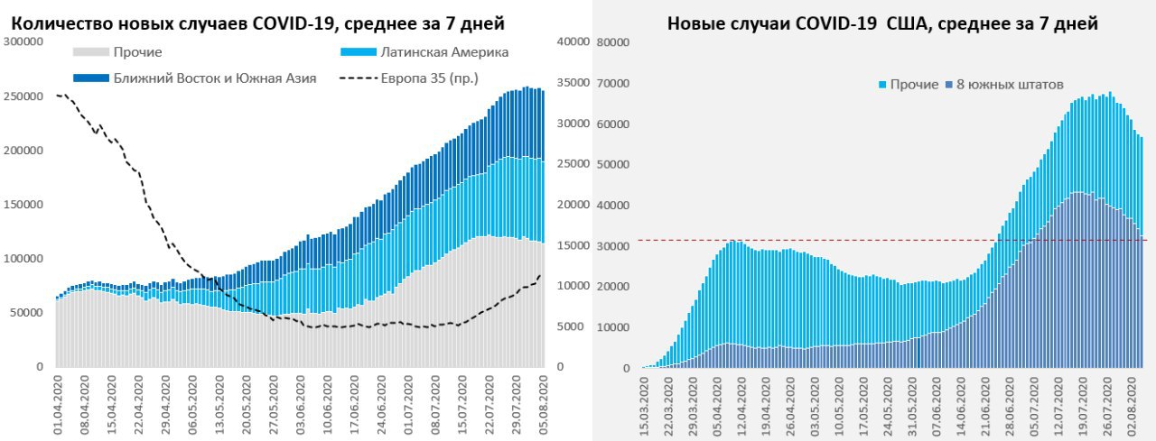 В мире среднее за 7 дней количество новых случаев держится около 260 тыс. в день, рост притормаживает. Индия уверенно растет - более 50 тыс. новых случаев в день. Бразилия притормозила, но Латинская Америка в целом продолжает рост. Европа вошла в цикл роста, но пока количество новых случаев относительно небольшое.