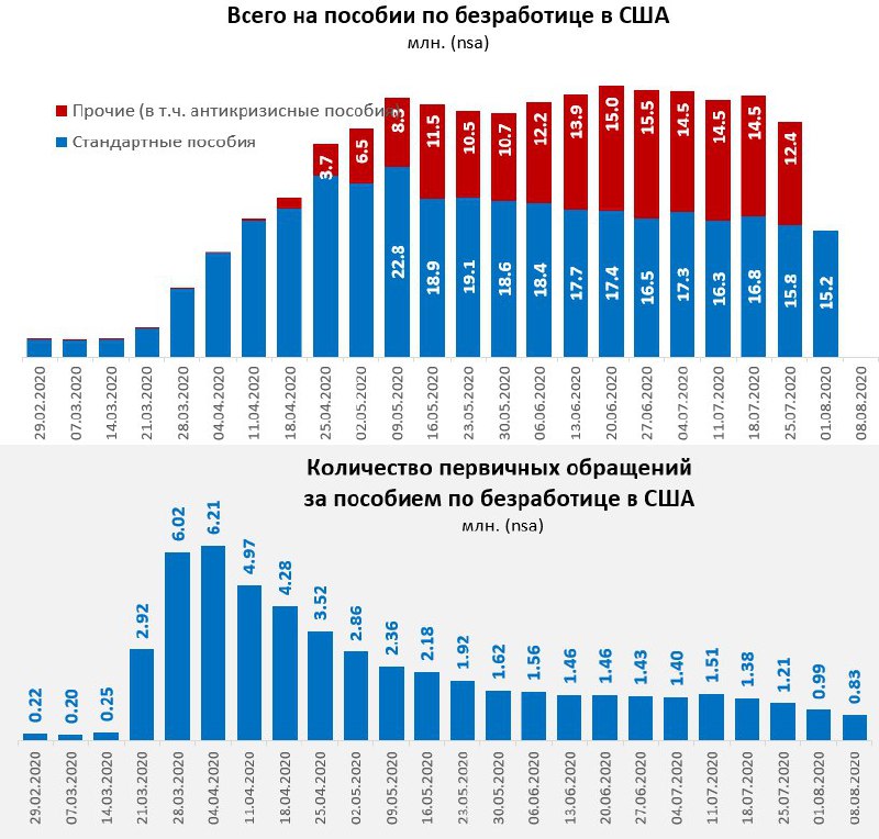 По поводу подписанного указа по продлению выплаты федеральных пособий - этот указ предполагает доплату из фондов госбюджета $300 в неделю и еще $100 в неделю из фонда Штатов. У госбюджета на эти цели всего $44 млрд (хватит примерно на 6 недель на 25 млн безработных, до выборов не зватит). По последним же заявлениям демократов и республиканцев договариваться о полноценном пакете поддержки они в ближайшие месяцы не торопятся. Будет интересно посмотреть данные по пособиям в ближайшие недели…