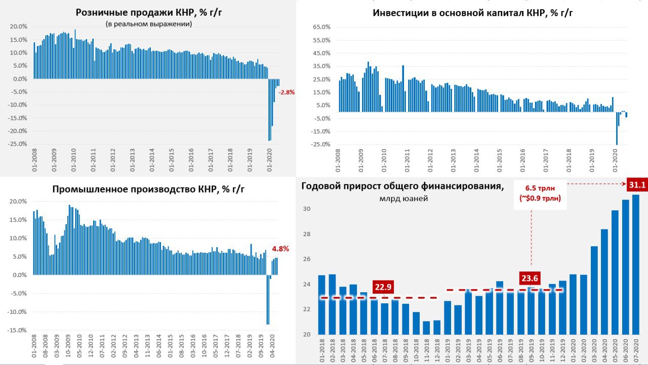 Отчеты по китайской экономике за июль указывают на торможение восстановления экономики. Хотя производство и демонстрирует рост на уровне 4.8% г/г, но в основном за счет внешнего сектора. Розничные продажи упали за год на 1.1% в номинале и на 2.8% г/г в реальном выражении – восстановление здесь прекратилось. Инвестиции после двух месяцев небольшого роста снова ушли в минус и выдали падение на 4.4% г/г.