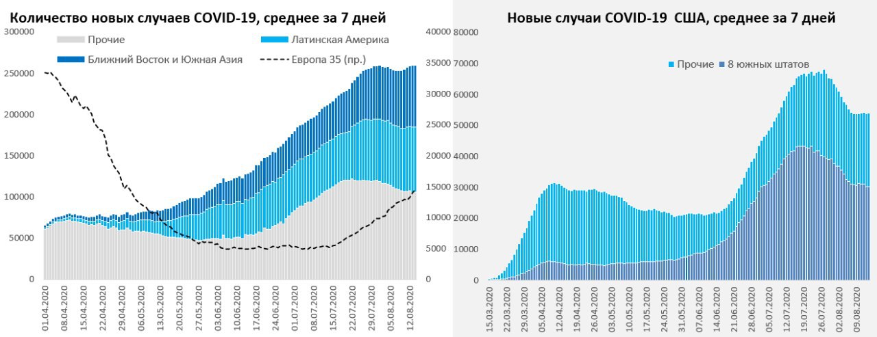 В мире среднее за 7 дней количество новых случаев пока остается вблизи максимумов 260 тыс. Индия генерирует более 60 тыс. новых случаев в день, регион Азии продолжает генерировать основной прирост новых случаев. Европа уверенно идет в рост, причём этот рост постепенно ускоряется в странах Западной Европы, в лидерах Испания и Франция, подтягиваются Германия и Великобритания.