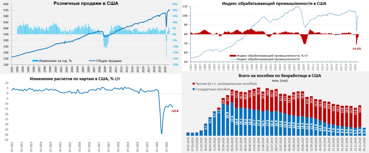 Розничный сектор в США, наоборот ожидаемо приуныл, номинальные продажи были на новых максимумах, но в последние два месяца началось падение продаж. В октябре сокращение составило символические 0.1% м/м, в ноябре оно ускорилось до 1.1% м/м. Но годовая динамика осталась положительной +4.1%. За 11 месяцев года номинальные продажи были на символические 0.2% выше аналогичного периода прошлого года. А вот расходы по картам так и не вернулись на прежние уровни, они остаются на 13.6% ниже уровней прошлого года, причем уже полгода здесь особой направленной динамики нет, а в последние пару месяцев прошло сокращение. Конечно, расходы низкие из-за сектора услуг: туризма, гостиниц и ресторанов. Но в целом динамика здесь тоже идет на спад. Очевидно, что декабрь здесь позитивным не будет.