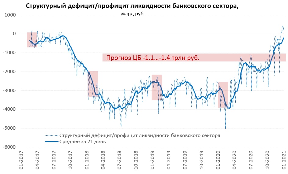 Что дальше…Обычно к середине февраля – марту ликвидность возвращается в систему, люди направляют полученные в декабре 13-е зарплаты и премии в безнал через: потребление, погашение кредитов, депозиты. Но в этом году есть и дополнительные каналы – возможно покупка валюты, акций/облигаций (в т.ч. иностранных). В этом году не исключено, что кэш вернется не весь … потому ситуация с ликвидностью может оказаться несколько хуже, но все же должна вернуться к небольшому профициту в первом квартале.