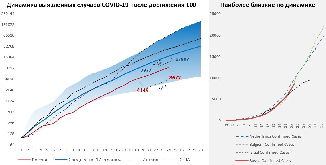 Относительно текущей динамики заболевших в России – ситуация немного улучшилась, рост новых выявленных случаев замедлился до 601 человек за день после скачка в предыдущий день, общее количество выявленных случаев достигло 4149 человек. В общем-то здесь мы идем вблизи средних темпов роста без сильного ускорения.