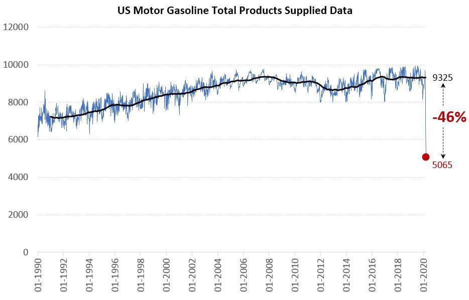 За неделю по 27 марта (все данные по потреблению бензина в США на последний четверг марта) показали обвал относительно прошлого года на 25%. Уровень потребления оказался самым низким для этого периода времени за последние 20 лет (на самом деле Finished Motor Gasoline Supplу - минимум за 30 лет). В США карантинные ограничения слабее (падение траффика общественного транспорта 60-70%), чем в Европе (75-90%), по сравнению с концом марта ситуация сейчас изменилась в худшую сторону (но не сильно, скорее инерционно). Так что в Европе должно быть еще веселее. Падение потребления нефти в мире будет ударным, прогнозы сокращения потребления 10-20 мбд вполне релевантны ситуации.