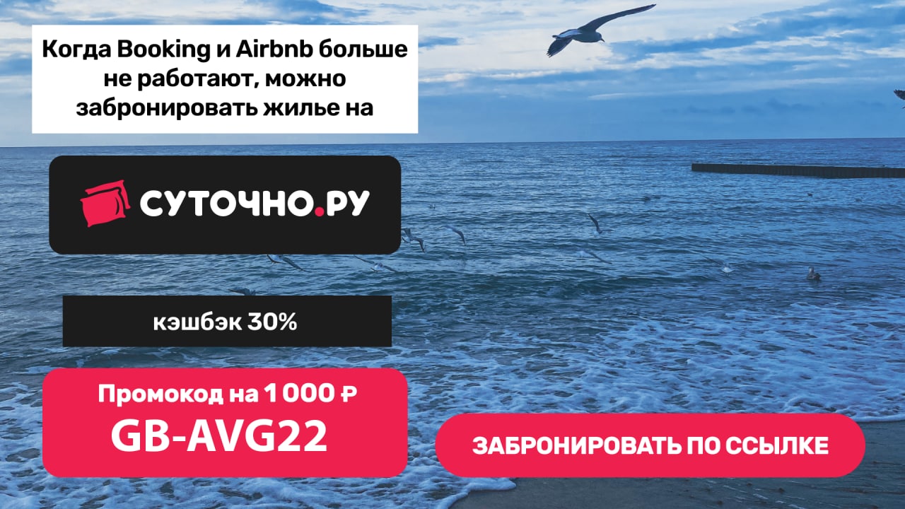 GB-AVG22 дают бонус в 1 000 ₽ на бронирование любого жилья на сайте.Боонусом можно оплатить 10% суммы бронирования. А после первой поездки вернут аж 30% кэшбека, который можно тратить на будущие поездки.