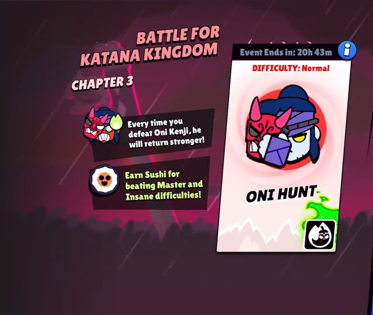 Оні Кенджі має різні атаки. Коли розділ з "Полюванням на Оні" розпочнеться, Ви отримаєте нагороди за 7 днів.