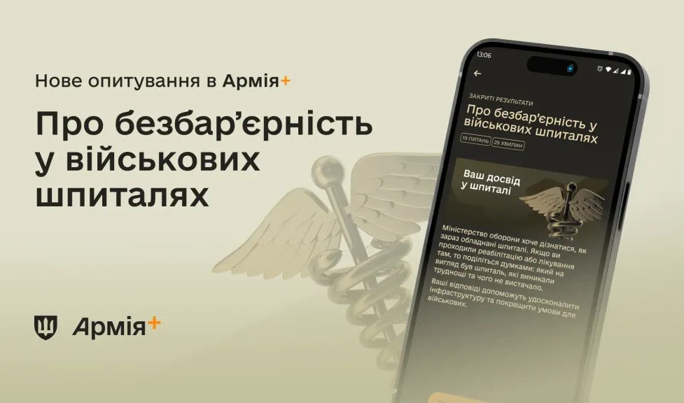 У застосунку «Армія+» запустили нове опитування — цього разу розпитують про забезпечення безбар'єрного простору у військових шпиталях. Опитування, яке складається з 19 питань, можна пройти до 14 травня.