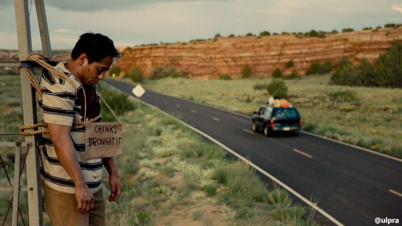 У фільмі є епізод, де головні герої проїжджають повітряний генератор, що стоїть біля дороги. На ньому висить труп особи монголоїдної раси із табличкою "Chinks brought it", у дослівному перекладі - "пиздоокі принесли це". Англійське слово "сhink" означає "щілина" і використовується для зневажливого расистського позначення азіатів - перш за все, китайців. Цікаве співпадіння, правда?