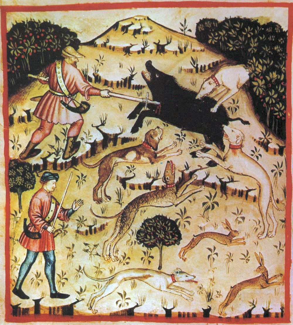 На картинці зображено середньовічне полювання на кабана із собаками. Tacuinum Sanitatis, популярний трактат про здоровий спосіб життя, XIV ст.