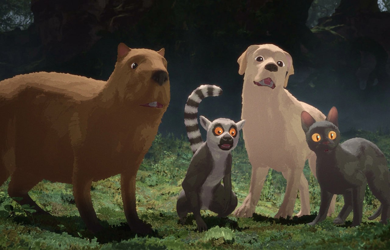 Но давайте всё-таки немного о сюжете. На первый взгляд, он незамысловат - чёрная (так говорят описания, а я всё-таки увидел серую 😁) кошка спасается от разбушевавшегося наводнения (всемирного потопа?), и плывёт по течению в лодке, но не одна, а в компании других зверей - капибары, лемура, собаки (лабрадора-ретривера), то и дело сталкиваясь как с другими животными, так и самыми разными стихийными передрягами...