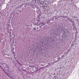 Делаем ИГХ и видим, что опухоль (помимо всего прочего) демонстрирует ядерную экспрессию b-catenin, что характерно для колоректальной аденокарциномы (но надо помнить, что и в колоректальных аденокарциномах b-catenin не всегда окрашивает ядра, так что сопоставление с клинико-инструментальными методами исследования крайне необходимо!);
