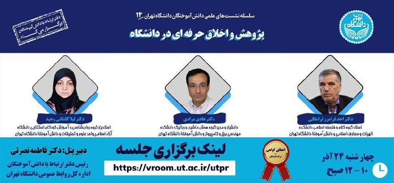 🔹دفتر ارتباط با دانشآموختگان دانشگاه تهران، چهاردهمین نشست علمی دانشآموختگان دانشگاه تهران را با موضوع «پژوهش و اخلاق حرفهای در دانشگاه»، چهارشنبه ۲۴ آذر برگزار میکند.