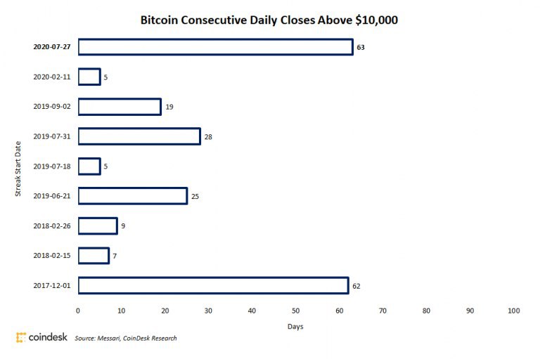 27 сентября первая криптовалюта, по данным агрегатора Messari, закрыла 63-й день подряд по цене выше $10000. Тем самым был побит предыдущий рекорд — 62 дня, длившийся c 1 декабря 2017-го по 31 января 2018 года.