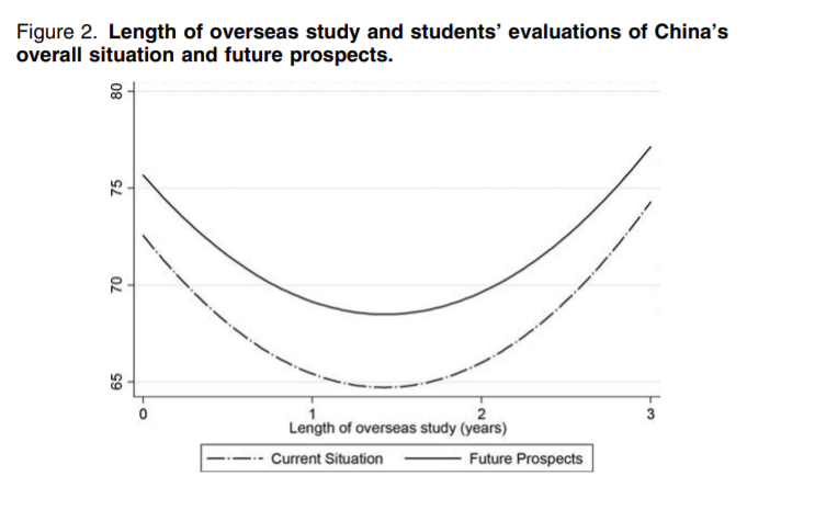 Кстати, такая реакция — совсем не исключение. Китайцы, уезжающие учиться за границу, не становятся поголовно поборниками западных ценностей, пытающимися построить либеральную демократию на китайской земле. Даже наоборот. Исследование, основанное на данных панельного опроса пекинских студентов, показывает, что взаимосвязь между между числом лет, проведенных за границей, и отношением к Китаю напоминает U-образную кривую: после первых лет учебы в другой стране студенты начинают относиться к Китаю куда более скептически (и к текущей ситуации, и к его перспективам в будущем), зато если останутся за границей хотя бы года на три, становятся даже более патриотичными, чем до отъезда.