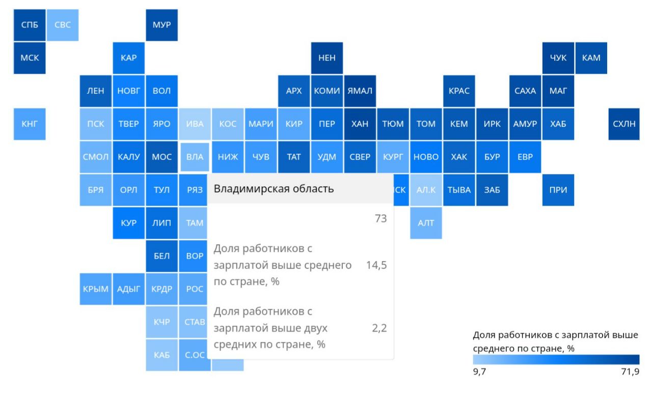 Владимирская область оказалась на 73 месте в России. По результатам исследования лишь14.5 % работников нашей области получают зарплату выше средней по стране.