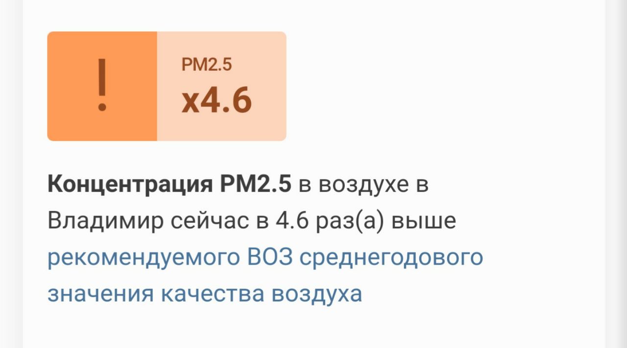 Концентрация PM2.5 в воздухе во Владимире сейчас в 4.6 раза выше рекомендуемого ВОЗ среднегодового значения качества воздуха.