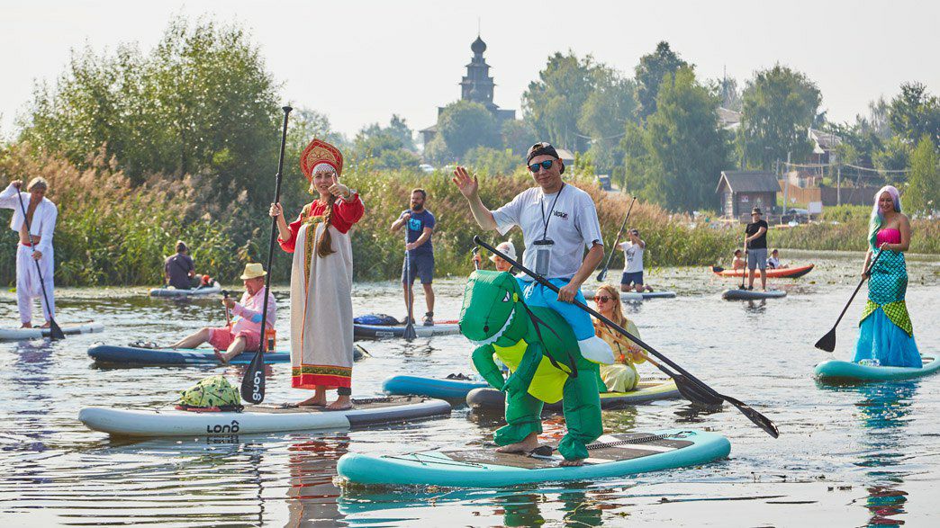 В городе Суздаль любители речных катаний на сапбордах провели заплыв в маскарадных костюмах.