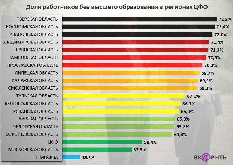 На этот раз подсчитали количество работников не имеющих высшего образования в регионах ЦФО.