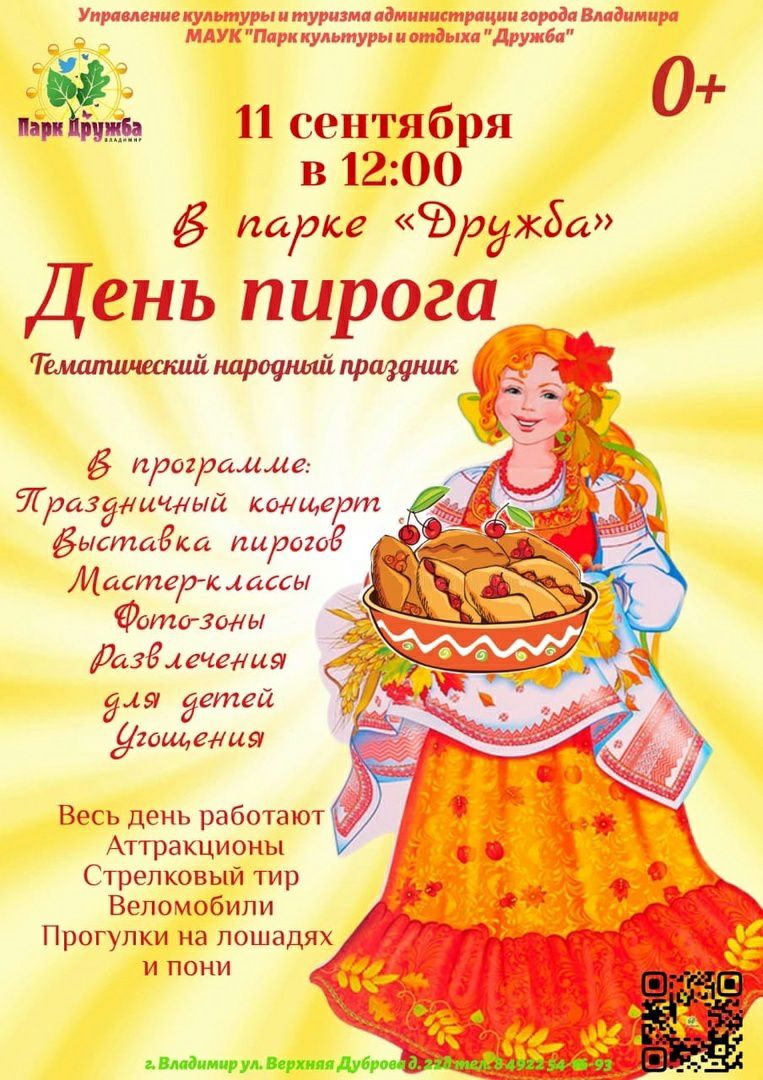 В парке «Дружба» города Владимира всем гостям представится возможность отведать выпечку с разнообразной начинкой, выбрать пирожок себе по вкусу и пополнить «копилочку» домашних рецептов.