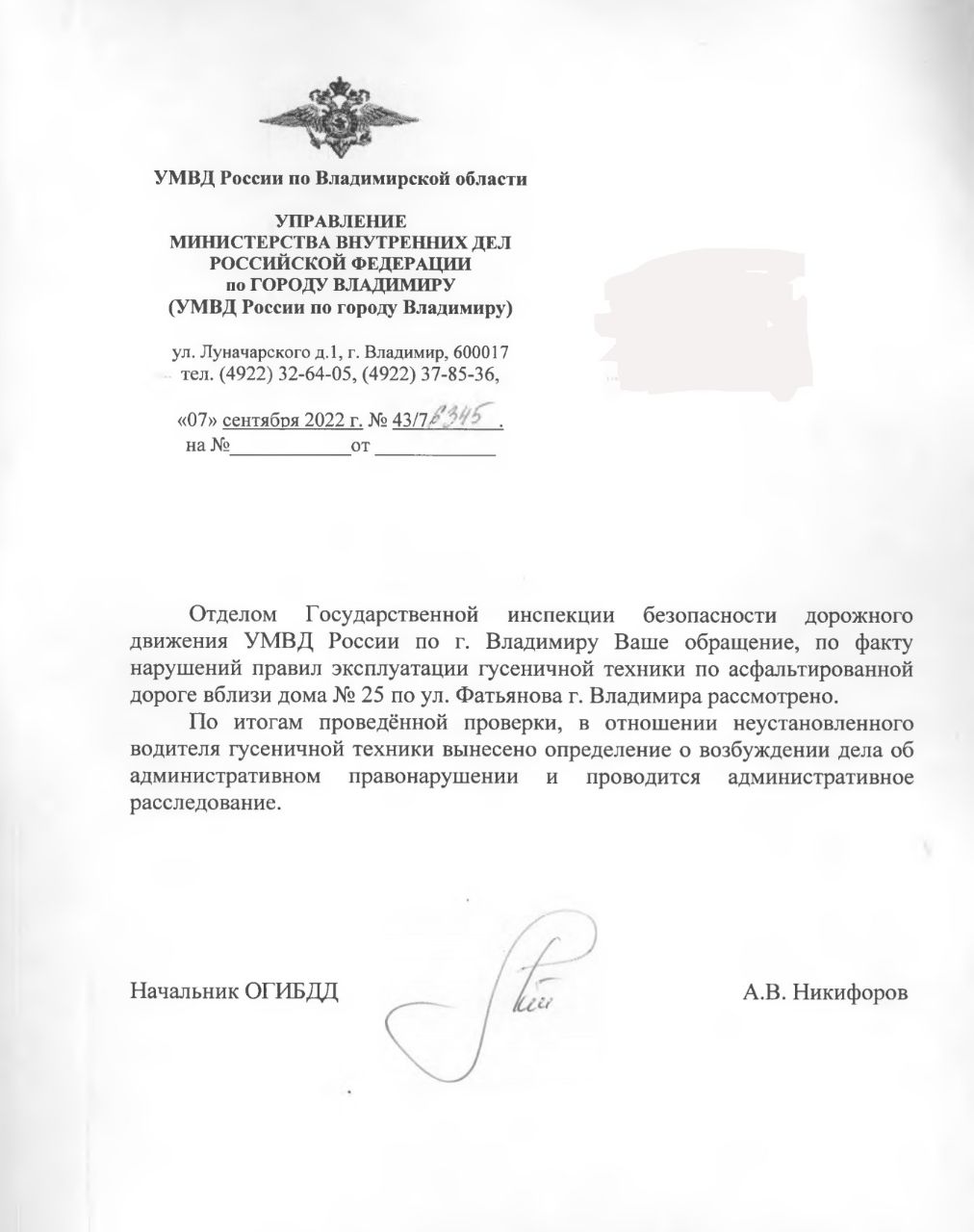 В отношении водителя гусеничной техники, который проезжал по асфальтированной дороге у дома 25 по улице Фатьянова во Владимире, вынесено определение о возбуждении дела об административном правонарушении.