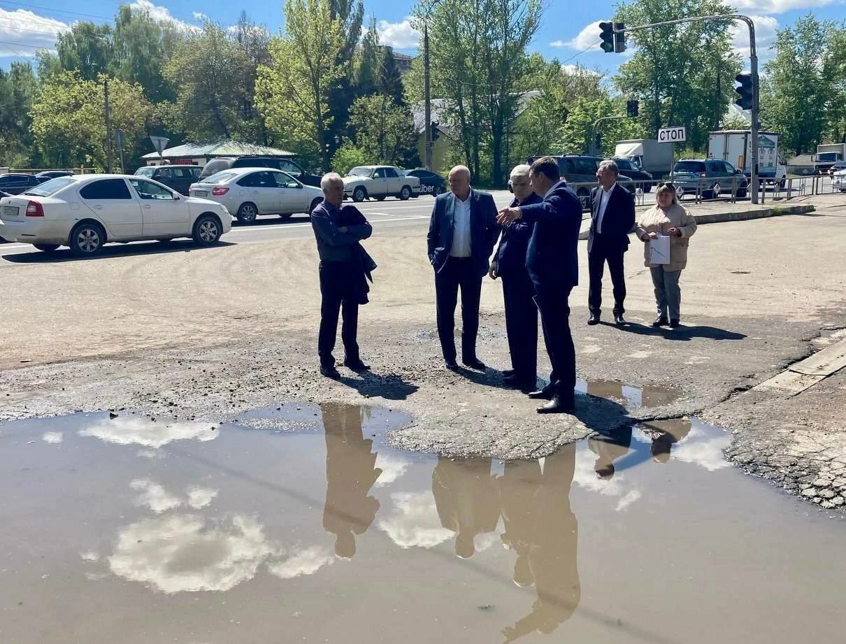 Андрей Шохин с другими официальными лицами мэрии города Владимира решают сложную задачу. Сколько асфальтной крошки понадобится, чтобы засыпать лужу?