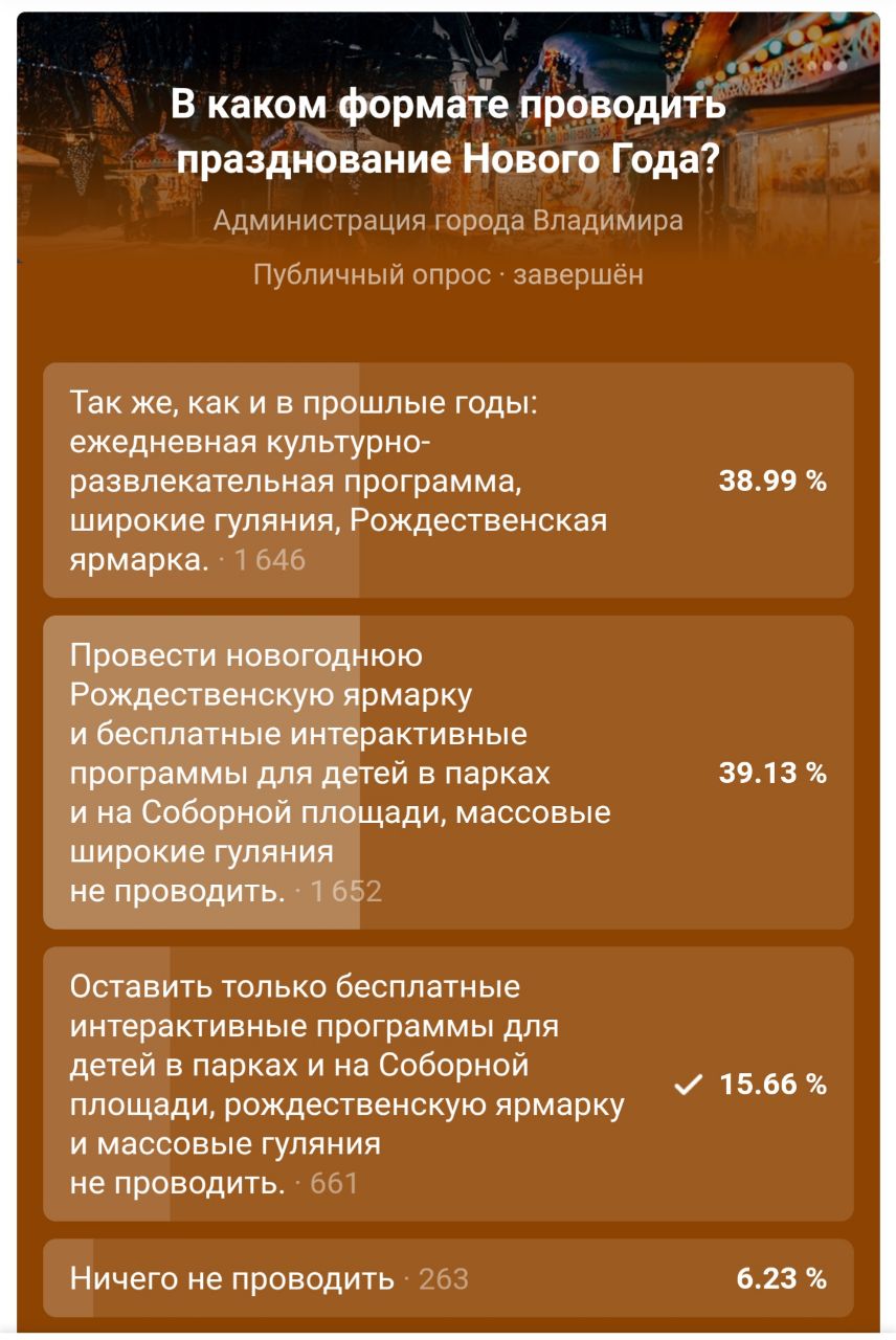 После опроса в официальном паблике Владимирской мэрии выбран компромиссный вариант без массовых гуляний, но с бесплатными интерактивными программами для детей и Рождественской ярмаркой.