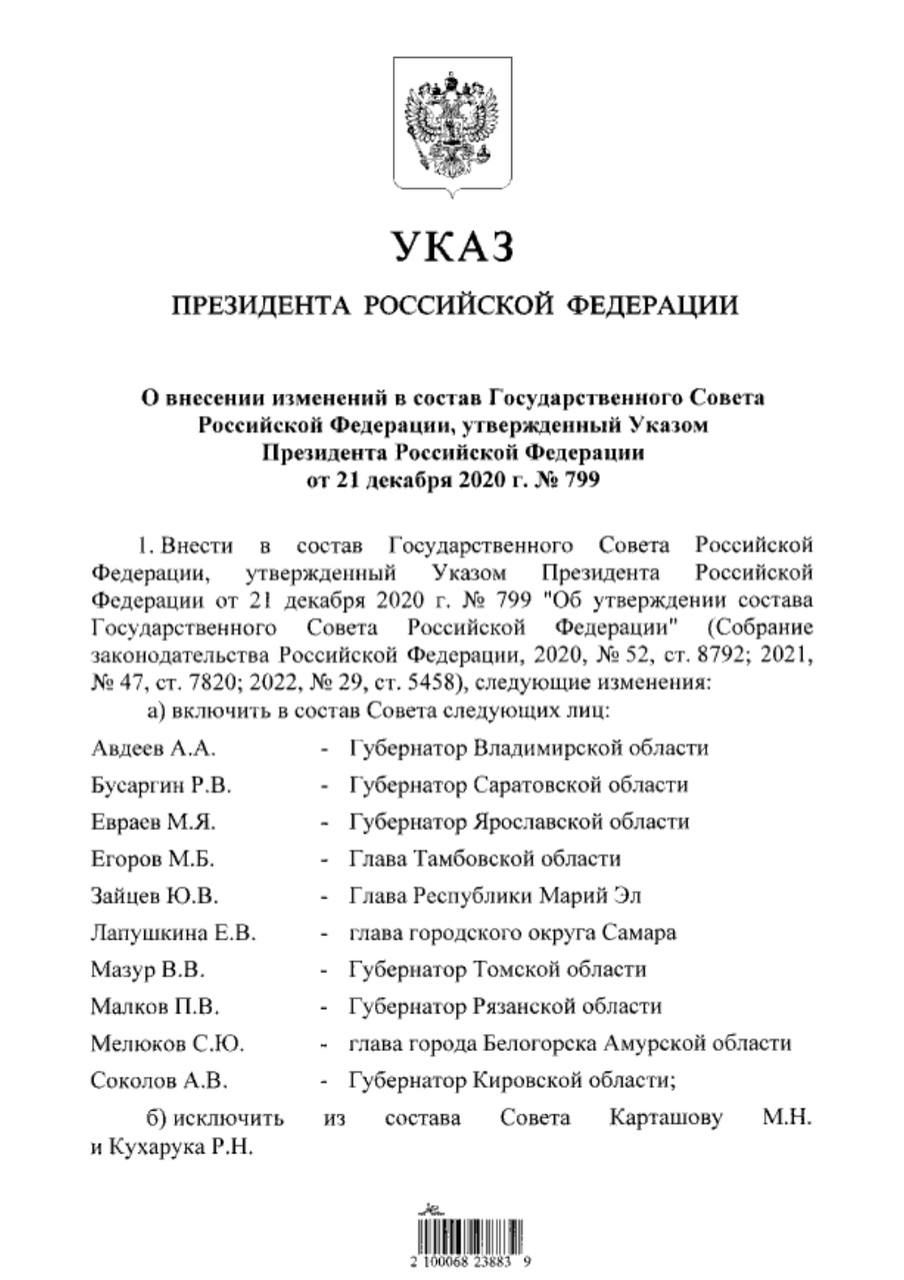 Президент РФ Владимир Путин включил в Госсовет губернатора Владимирской области Александра Авдеева.
