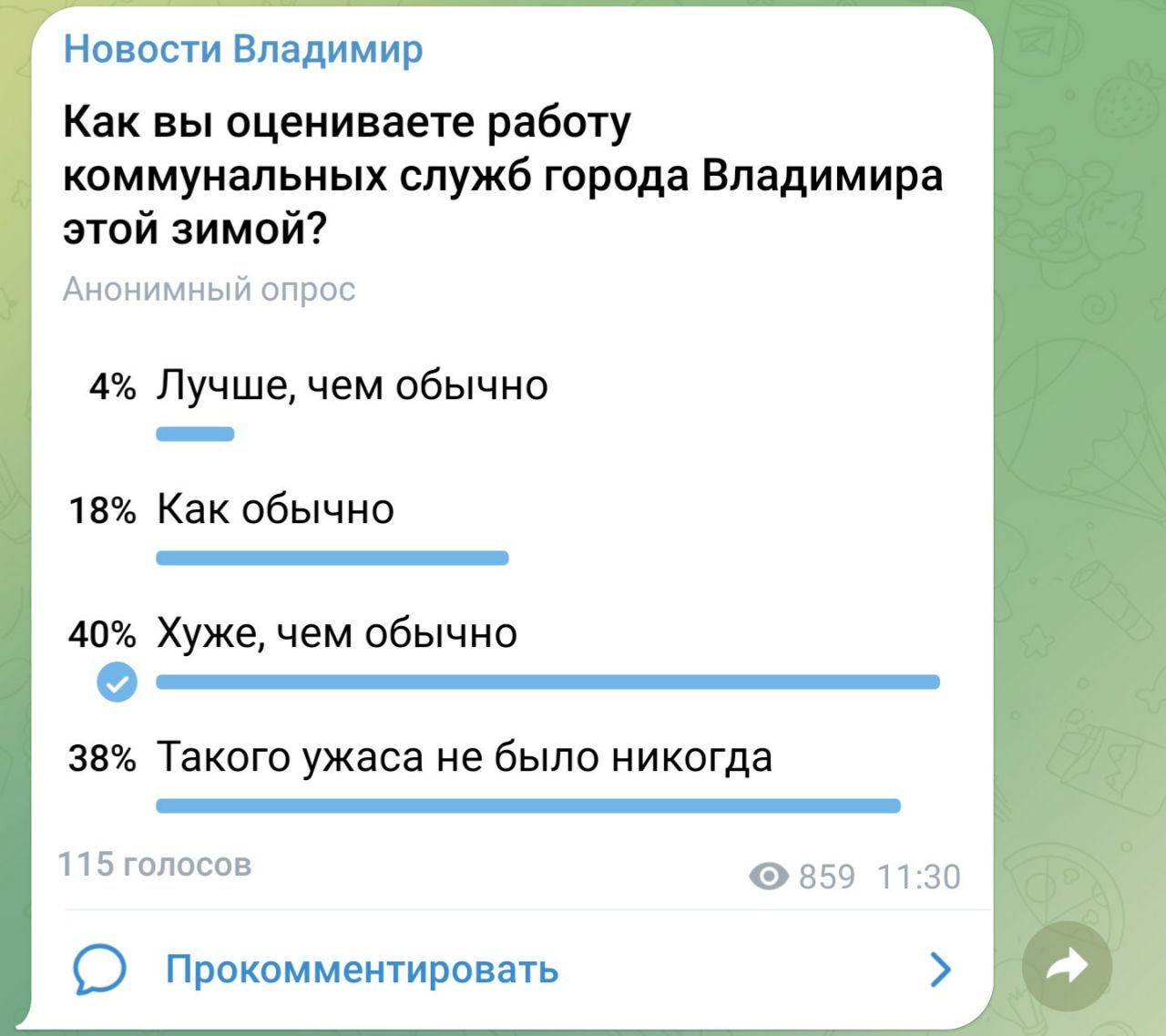 За Лучше, чем обычно проголосовало 4% (5 голосов) и это, наверное, представители городской мэрии в соцсетях 🤷♂️