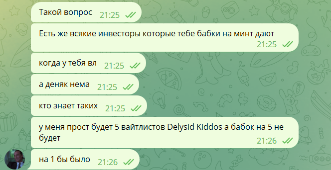 Так продолжалось недели две, пока мой гений ресерча не показал мне проект Delysid Kiddos на солане. Они делали что-то вроде Саббера, но тогда ни о каком Саббере никто не слышал. Я поверил в идею, в фаундеров, каким-то чудом убедил ребят с команды лутать этот проект просто на энтузиазме. Мы выбили 5 вайтлистов, это было сложно, но мы это сделали, напомню, что с максимально неопытными воркерами, которые обучались с нуля. Забавно, что один вайтлист мы получили, потому что девушка из команды скинула фаундеру фотку ножек из интернета. Будто вчера помню, как Маша (так звали работницу) звонила мне и мы около часа угорали с этой хуйни. Я продолжал верить в проект, на ОТС они в моменте стали фаворитом и продавались по 50$, но я знал, что они дадут больше. Была небольшая проблемка...у меня не было денег на минт даже одного джпега. Пришлось залезать в долги, мой кент Данек без каких-либо вопросов закинул мне 10к и сказал, что верит в то, что у меня все получится. Мораль: держите правильных людей рядом, Данек респект. Я заминтил все 5 штук и ждал. Каждый день меня спрашивали "Когда сливаем?", но я знал, что 4 соланы (фп на тот момент) не предел. И вот, сижу я на их АМЕ и тут они анонсируют стейкинг, я знал, что именно после него начнется памп. Так и было, на следующее утро я проснулся и увидел 9 SOL фп на Мэджике. Не помню, сколько тогда стоила солана, но моя доля с профита должна была составлять около 30к рублей. Угадайте, что произошло дальше? Я не успел слить и еле как продал все по 1-3 SOL. Такие пироги. Я залез в долги и еще большую апатию. Лишь через несколько месяцев я раскидал всем деньги и как-то вернулся в прежний ритм.