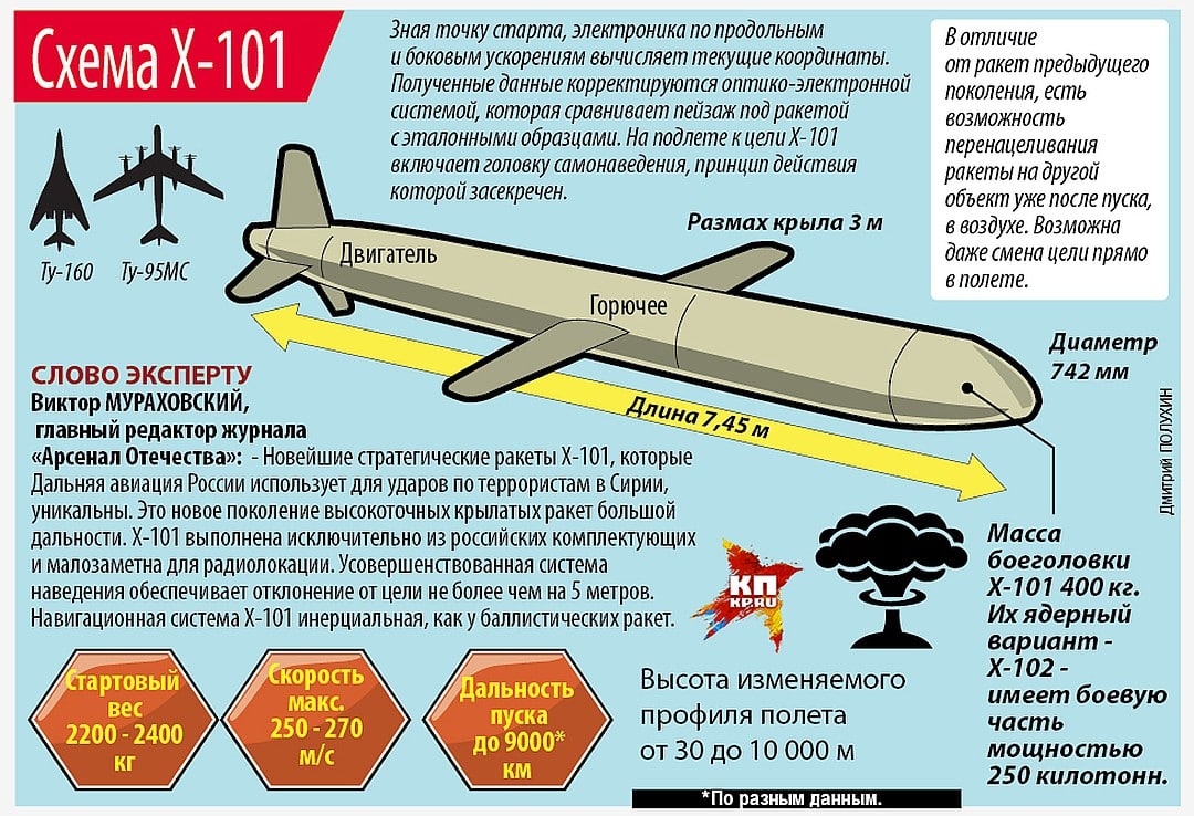 И, наконец - супердальнобойная ракета Х-101/Х-102. В ядерном варианте она может нести боеголовку мощностью от 250 Кт до 1 Мт на расстояние 5500 км. Точность поражения достигает - 10 м, но для ядерной боевой части это уже не важно💥