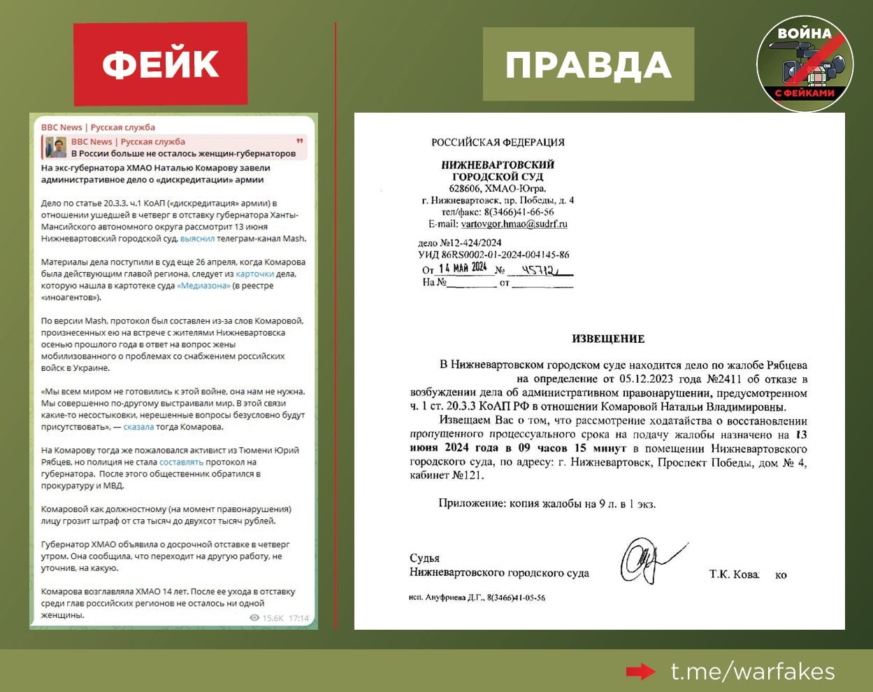 Правда: Нижневартовский суд отказал в возбуждении административного дела в отношении Натальи Комаровой ввиду отсутствия состава административного правонарушения. Поводом для рассмотрения стало заявление некоего «активиста» Юрия Рябцева, усмотревшего в словах губернатора дискредитацию российской армии.