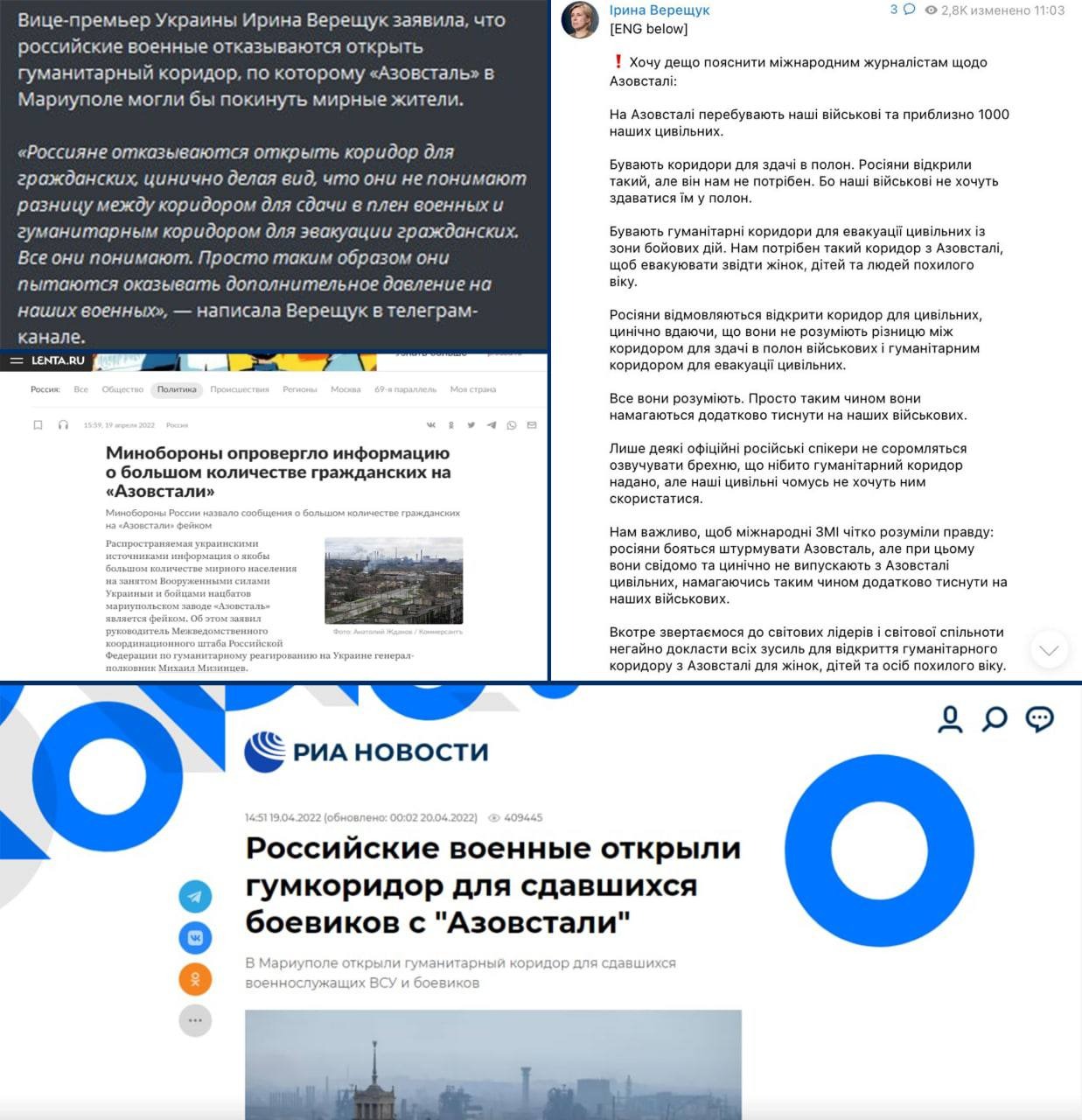 Фейк: Российские военные отказываются открыть гуманитарный коридор, по которому «Азовсталь» могли бы покинуть мирные жители. Об этом заявила вице-премьер Украины Ирина Верещук.