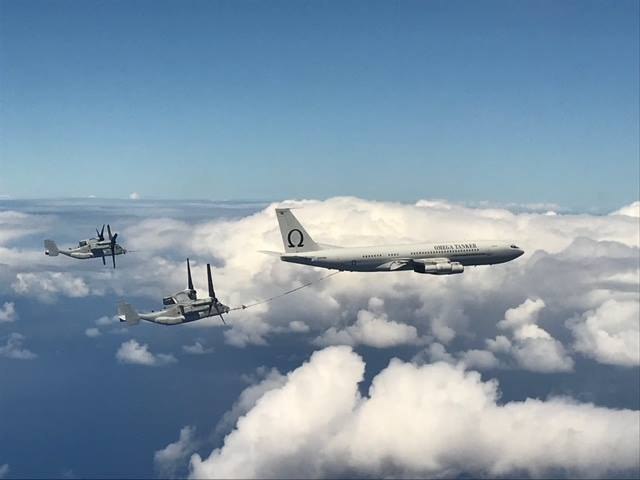 Топливозаправщик частной компании «Омега Эйр» заправляет военные конвертопланы MV-22B Osprey. Как частные ВВС помогают государственным вооруженным силам можно прочитать тут: https://wrhd.su/2OrfnUj