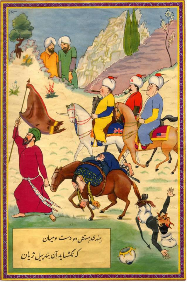 Британская пропаганда для населения оккупированного союзниками Ирана. Персонажи легко узнаваемы даже в особой национальной стилистике. Как и зачем союзники заняли Иран можно прочитать в этой статье: https://warhead.su/2017/10/17/persidskiy-pohod-stalina