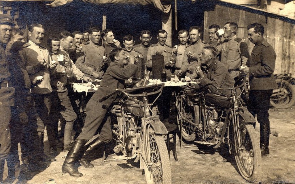Бойцы-самокатчики Русской армии отмечают Пасху на фронте. Самокатчиками тогда называли и мотоциклистов, и велосипедистов. Как воевали велосипедисты: https://warhead.su/2018/04/26/velodraguny-v-boyu-voyna-s-pedalnym-privodom?