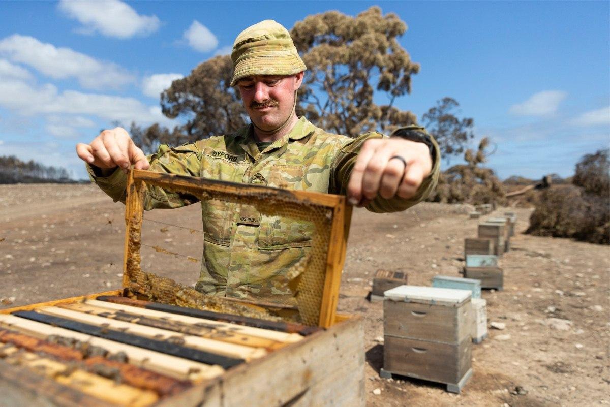Солдат австралийской армии Дэниэл Байфорд, занимавшийся "на гражданке" пчеловодством, проверяет ульи, пострадавшие от пожаров в