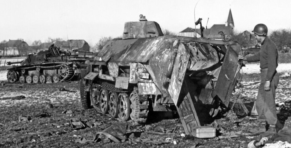 Уничтоженные бронетранспортёры бригады сопровождения фюрера. Эта элитная часть была развернута из батальона охраны Гитлера. В декабре 1944 года бригада приняла участие в Арденнской операции и попытке штурма Бастони. Как американцы прорывались на помощь блокированным десантникам из 101-й воздушно-десантной дивизии: https://warhead.su/2018/12/20/tankovoe-nastuplenie-v-ardennah-kak-amerikantsy-proryvalis-v-baston