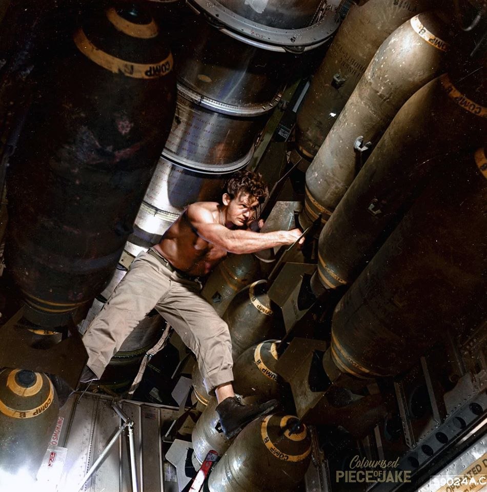 Механик проверяет крепёж бомб на бомбардировщике B-29 "Суперфортресс". Дело важное, потому что такая операция в воздухе грозит катастрофой. Как штурман чуть-чуть верхом на бомбе не прокатился и другие громкие инциденты в американской авиации: https://warhead.su/2018/12/11/krylatoe-razgildyaystvo-samye-gromkie-fakapy-amerikanskih-lyotchikov