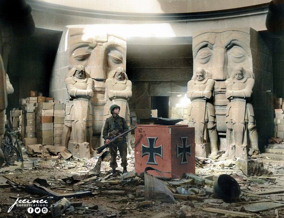 Американский солдат во внутреннем зале монумента в память о битве народов под Лейпцигом в 1813 году. Апрель 45-го. Здесь забаррикадировались 150 солдат СС, которые планировали обороняться здесь до последнего патрона. Но артиллерия их разубедила