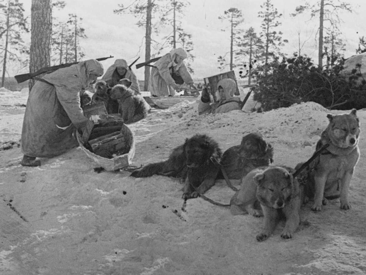 Советские солдаты готовят собачьи упряжки для перевозки груза. Мурманская область, 1943 год