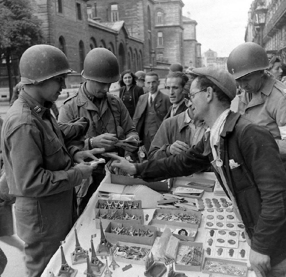 Как побывать в Париже и не привезти оттуда Эйфелеву башню? Американские солдаты покупают сувениры. 1944 год