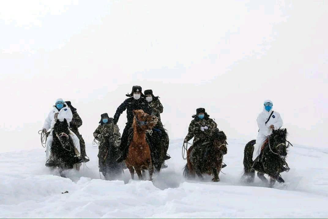До отдалённых горных сёл в Синьцзяне доезжает китайская конная полиция, чтобы вести им донести о коронавирусе. В масках и спецкостюмах, естественно.