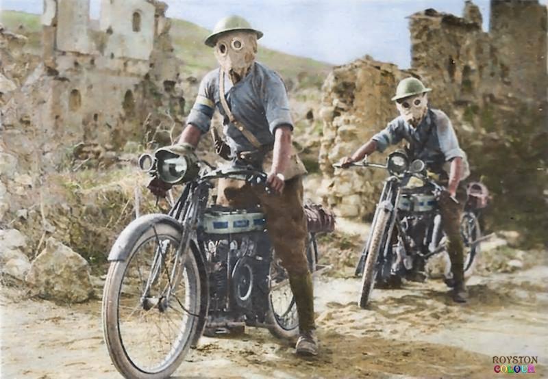 Два британских мотоциклиста корпуса связи в газовых масках на Салоникском фронте, ноябрь 1918 года