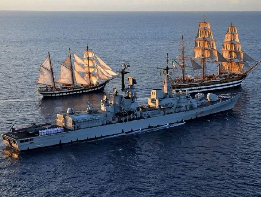 "Природа очистилась, в море возвращаются парусники". Итальянский эсминец "Луиджи Дуранд де ла Пенне" вместе с учебными парусными кораблями "Палинуро" и "Веспуччи" (впереди).