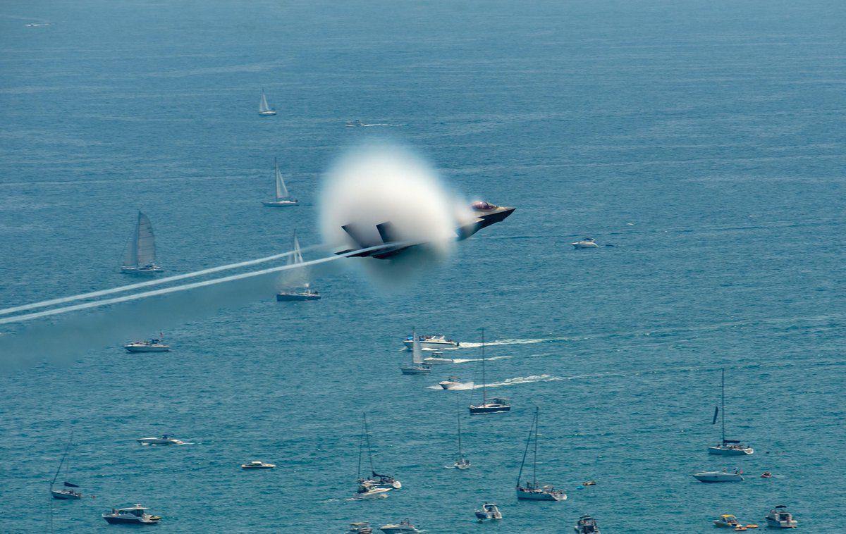 F-35А над озером Мичиган и эффект Прандтля-Глоерта (конденсация атмосферной влаги позади объекта, движущегося на околозвуковых скоростях).