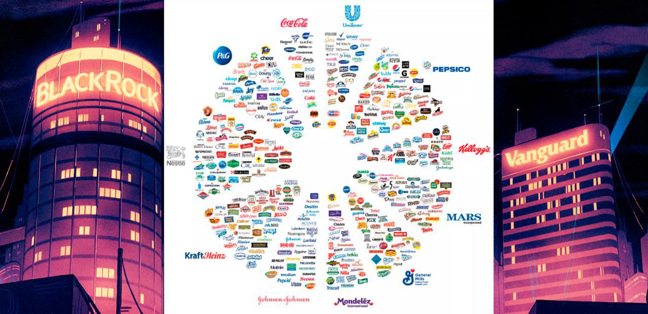 Возможно, вы уже видели эту картинку с продовольственными корпорациями, которые владеют практически всем, что мы с вами едим. Но все намного интереснее, часть акций этих компаний принадлежат 2 компаниям — BlackRock и Vanguard. Согласно отчету Bloomberg, к 2028 году эти компании вместе будут иметь инвестиции в размере 20трлн$.
