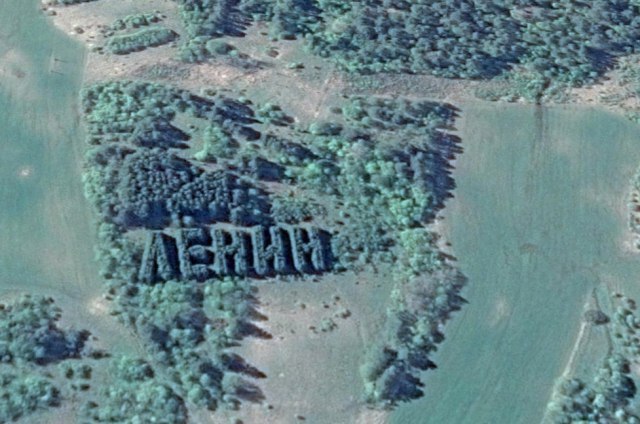 Геоглиф "Ленин" расположен в Вытегорском районе рядом с деревней Макачево. Аллею высадили весной 1924 года ученики местной школы. Сейчас надпись можно хорошо разглядеть с высоты.