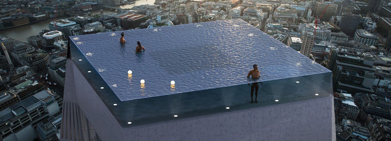 Британский производитель бассейнов представил проект Infinity London, который представляет собой бассейн объемом 600 тыс. литров и, как сообщается, будет установлен на крыше 55-этажного отеля, что позволит посетителям насладиться видом на Лондон с высоты 200 метров.